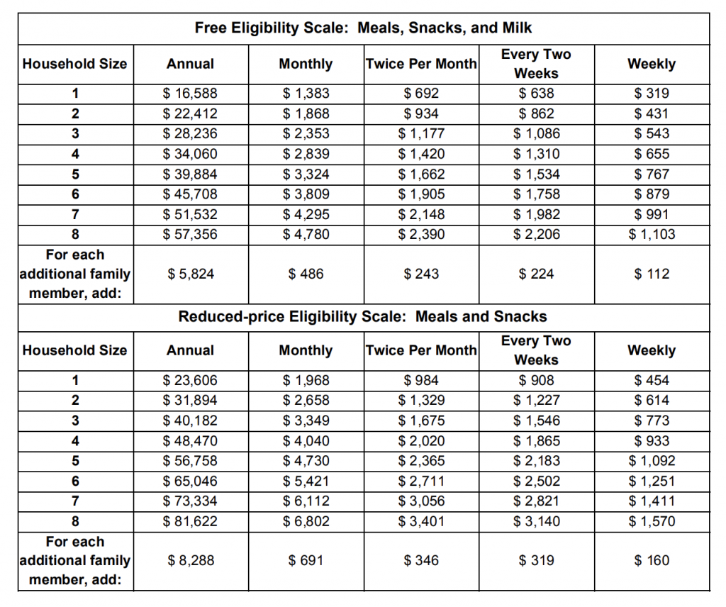 under the National School Lunch Program. Effective July 1, 2020 through June 30, 2021, children are eligible for free or reduced-price meals if the household income is less than or equal to the federal guidelines.