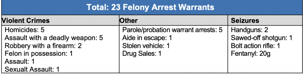 This “Violent Crime Reduction Operation” was an effort that identified wanted persons who had active felony warrants for violent crimes, such as homicide, assault with a deadly weapon, aggravated assault, robbery, and sexual assault.