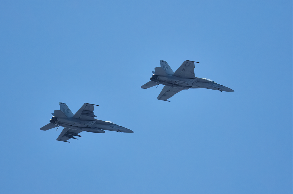 We were bombarded… no, wait, bad word, bad word… inundated, yes, better… we were inundated with calls about military aircraft zooming around over East Bay landmarks Saturday. Thanks to Sean McDonough’s magical camera and cat-like reflexes, we have a visual on the tangoes… uh, aircraft and we believe they are F18s preparing for a flyover…