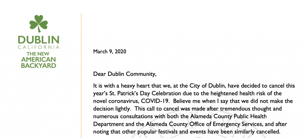 March 9, 2020 Dear Dublin Community, It is with a heavy heart that we, at the City of Dublin, have decided to cancel this year’s St. Patrick’s Day Celebration due to the heightened health risk of the novel coronavirus, COVID-19. Believe me when I say that we did not make the decision lightly. This call to cancel…